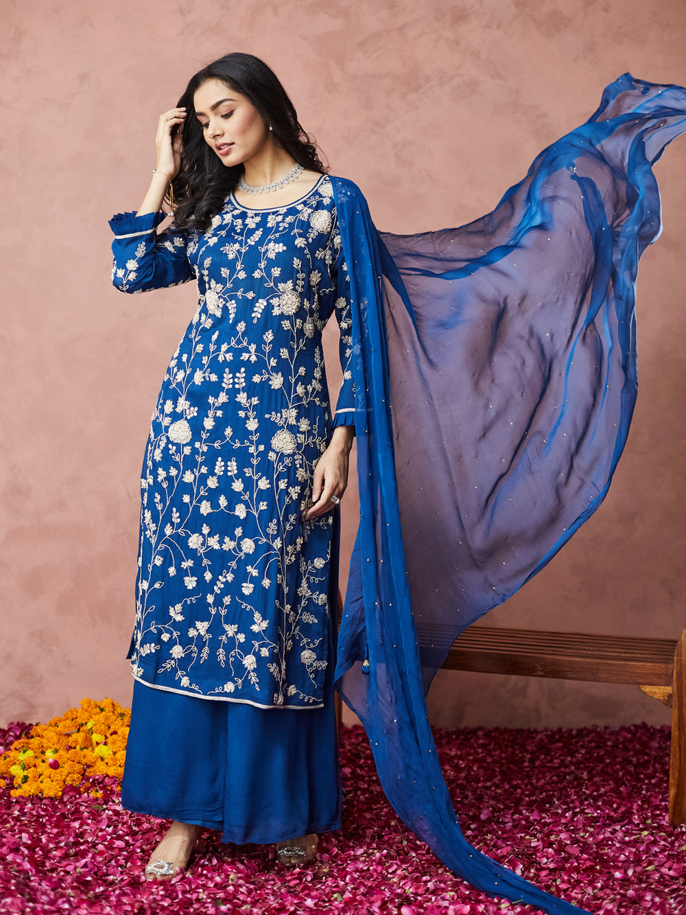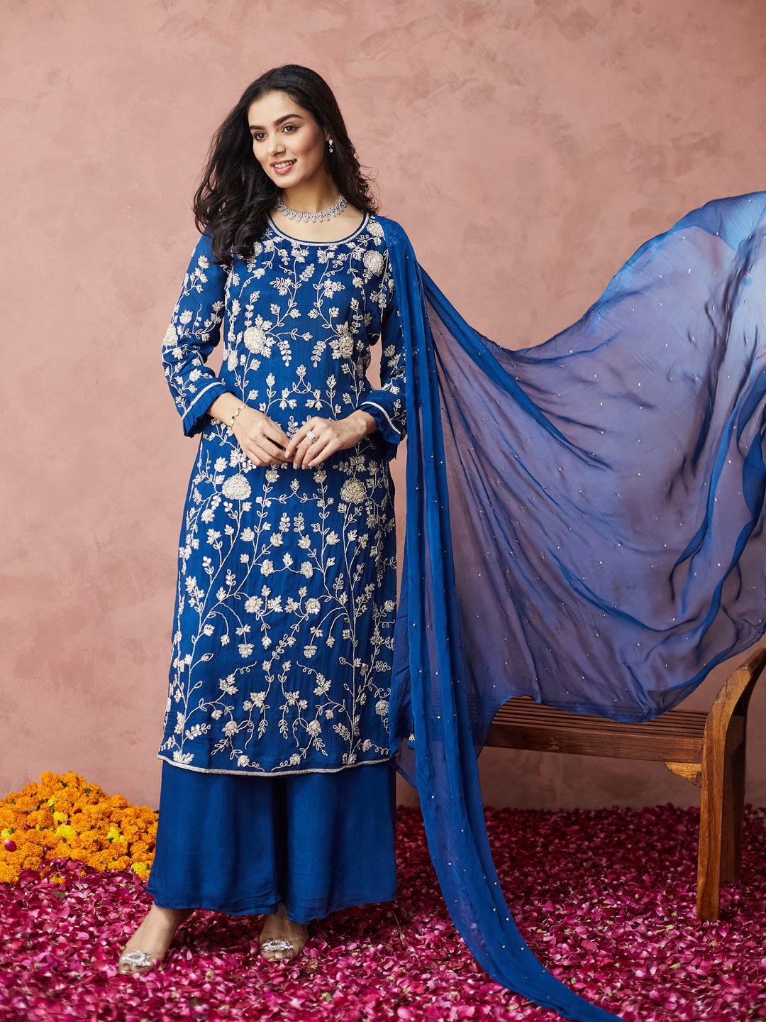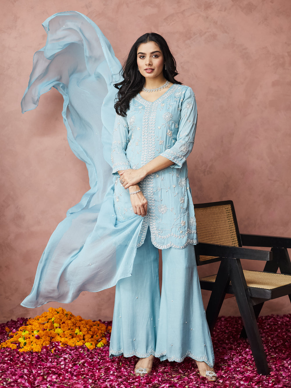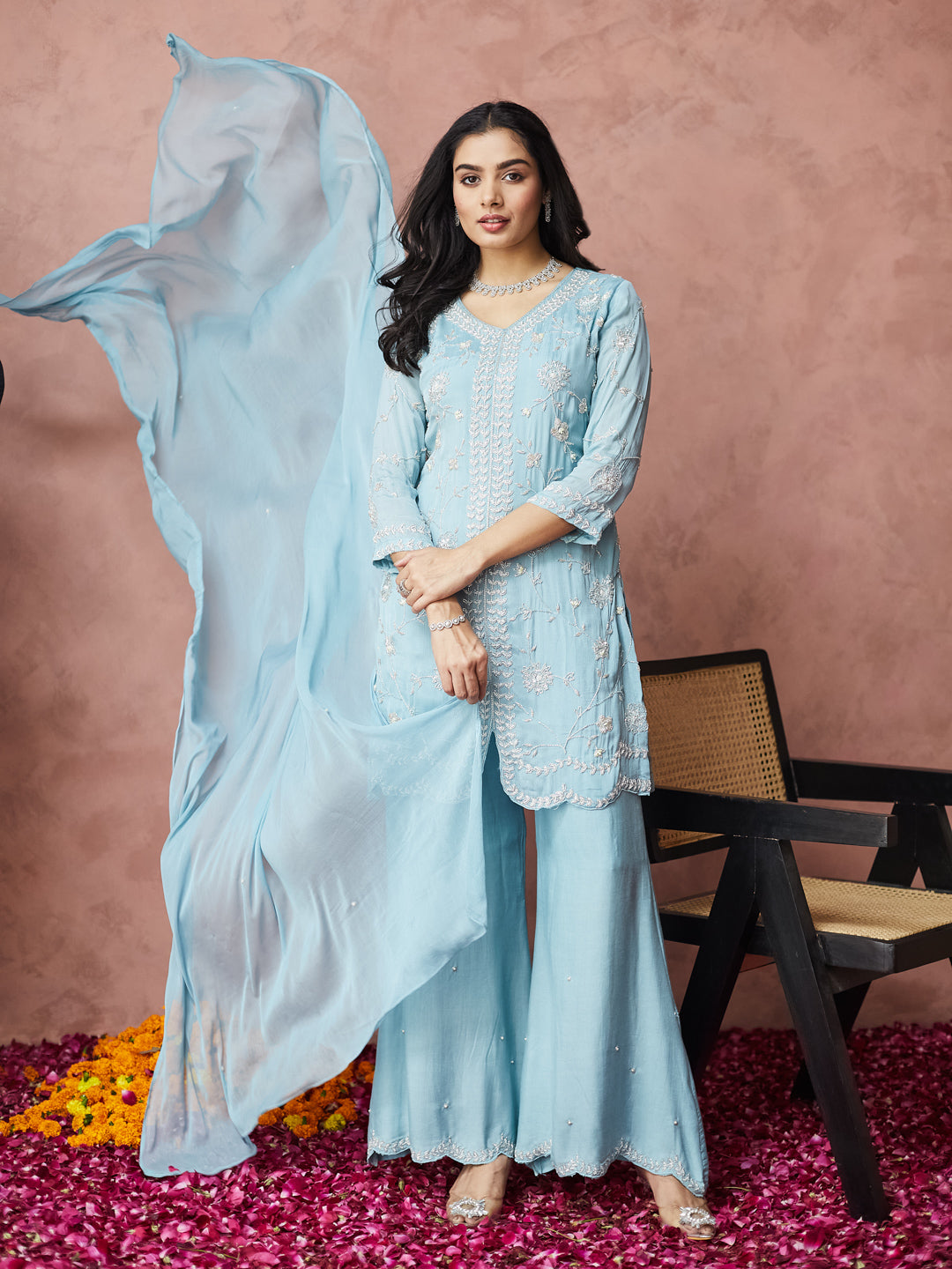TURQUOISE BLUE FLORAL PRINT JACKET SET WITH EMBROIDERED BLOUSE AND PLAZO