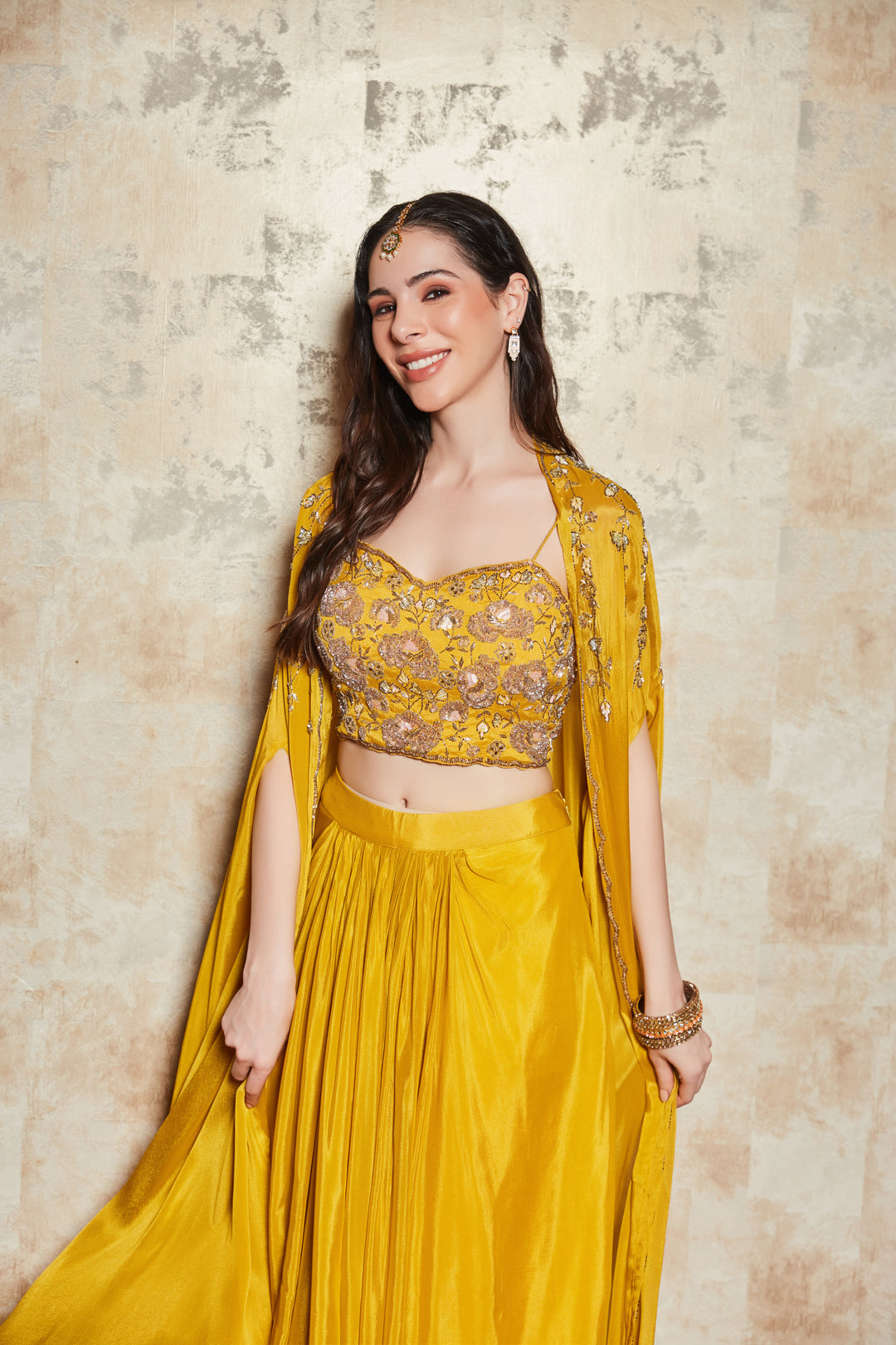 Mustard Bead Embroidered Jacket Set With Floral Embroidered Blouse And Pleated Skirt