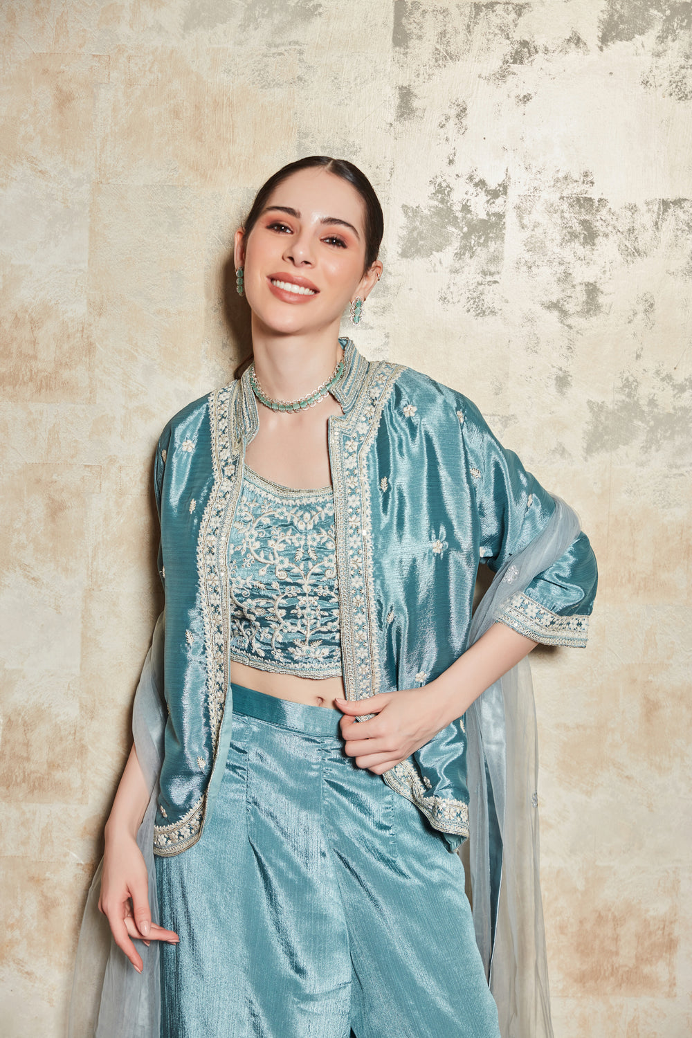 TEAL THREAD WORK JACKET SET WITH PLAZZO