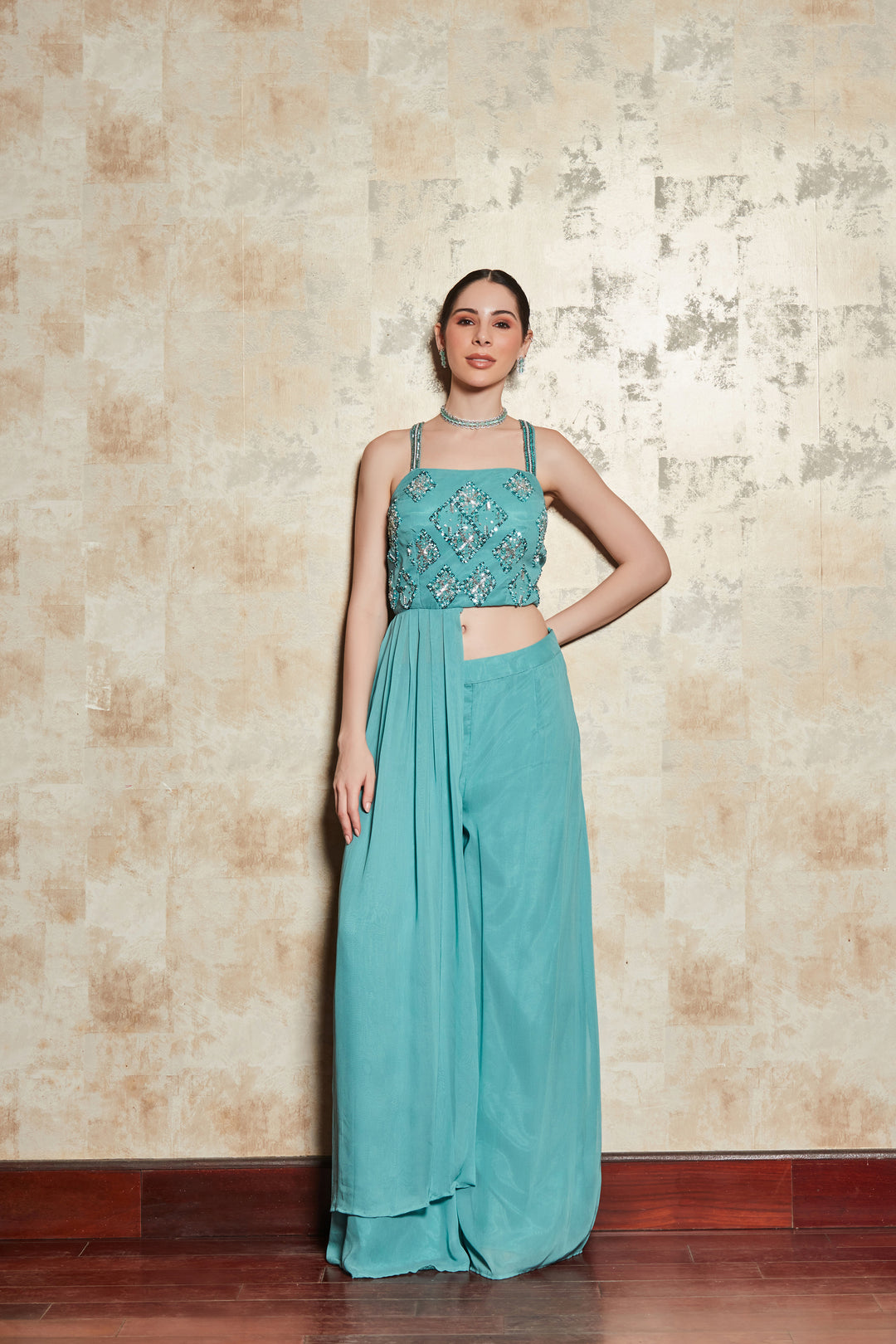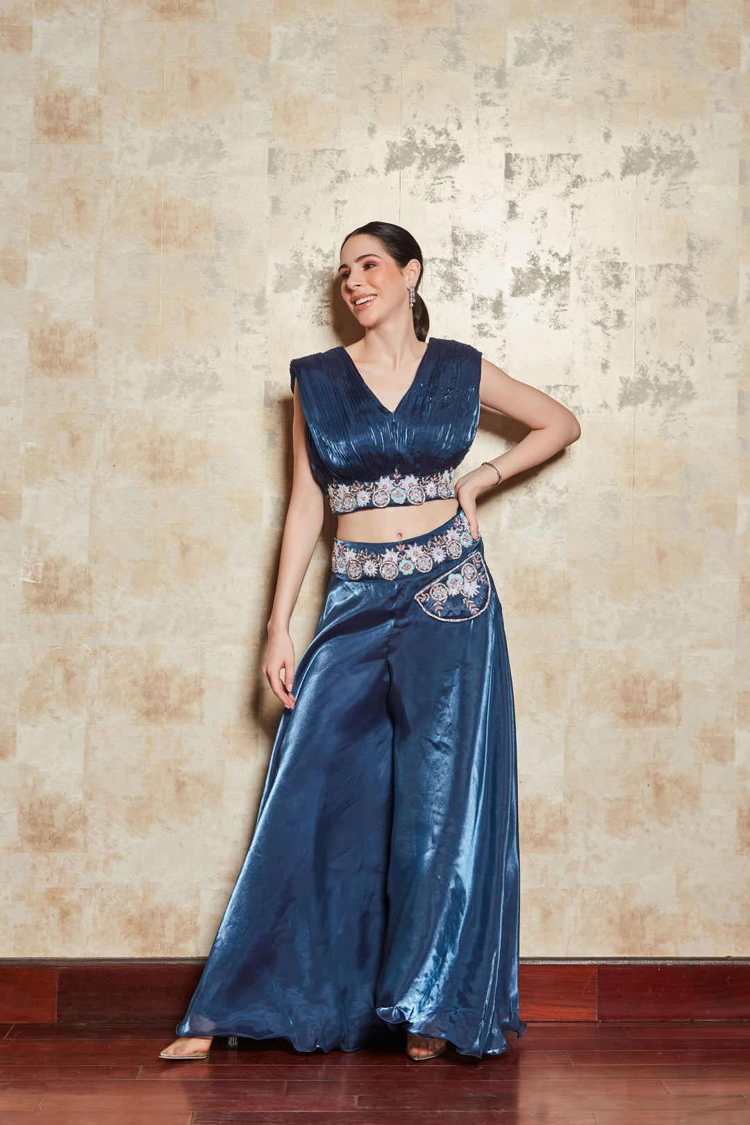 BLUE CROP TOP SET WITH EMBROIDERED BLOUSE