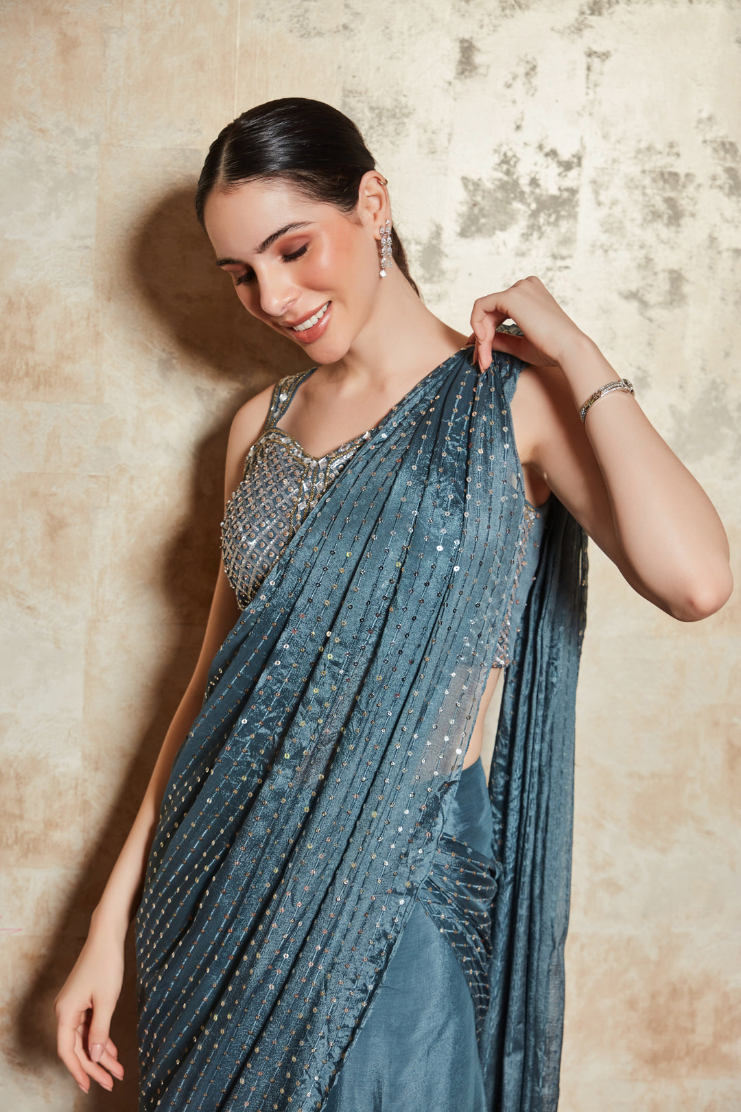 BLUE JUMPSUIT SAREE WITH BLOUSE