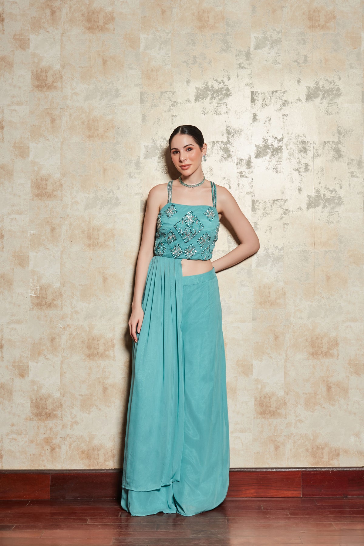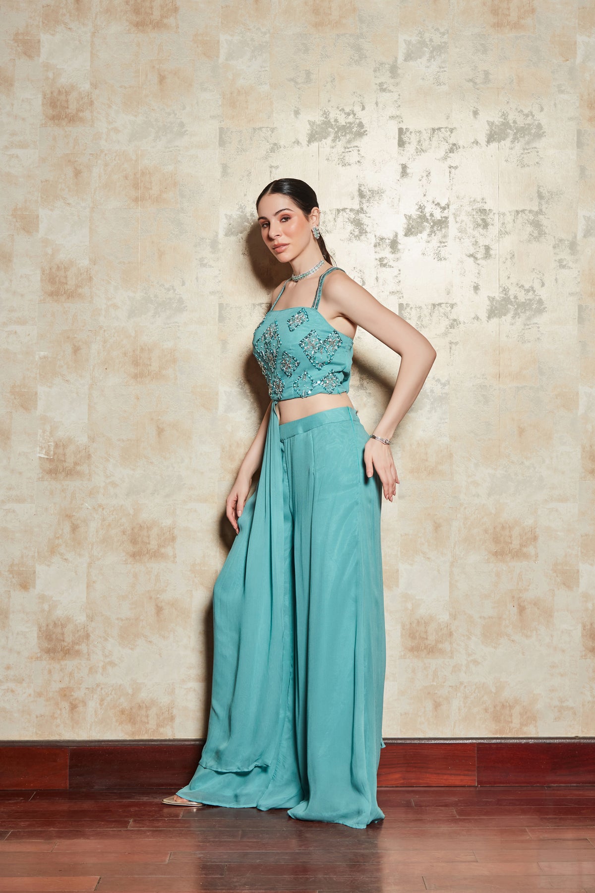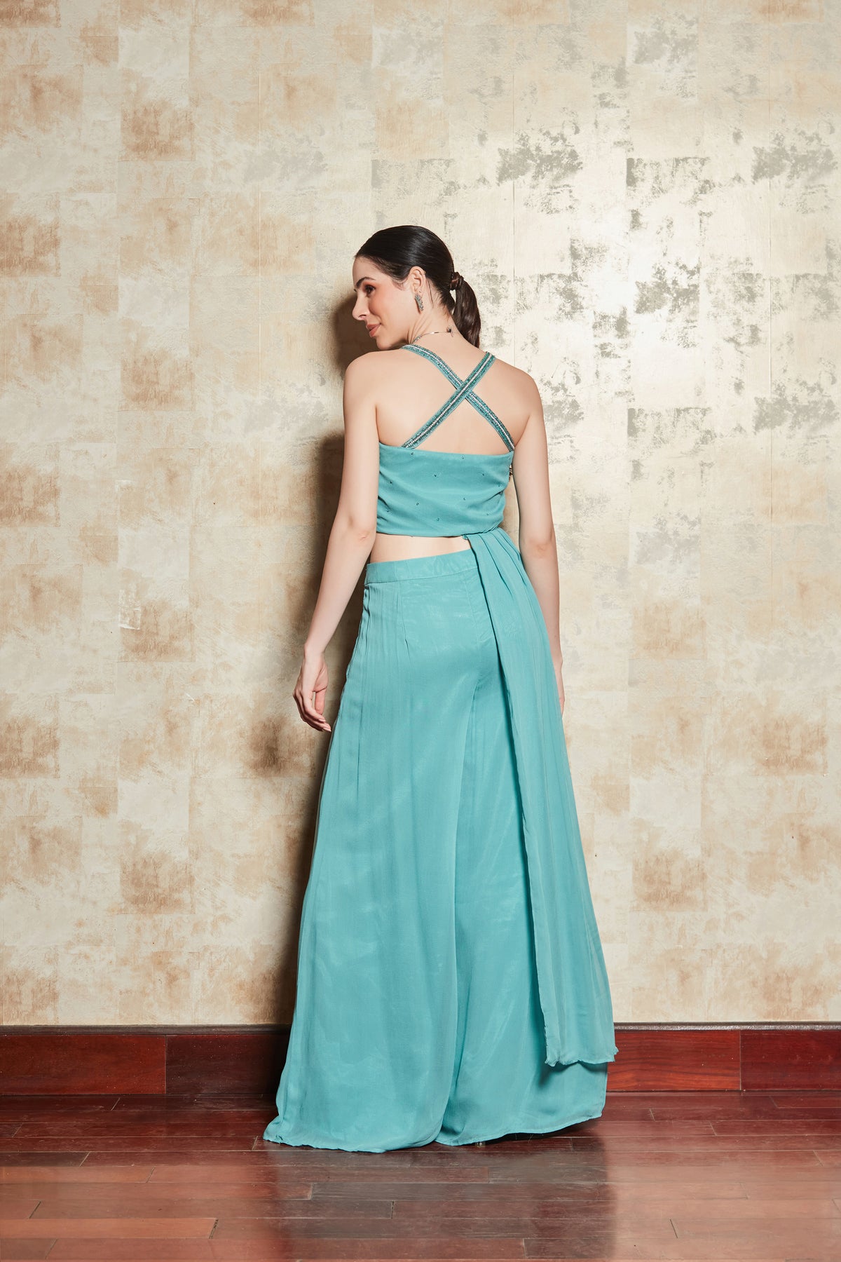 BLUE CROP TOP SET WITH EMBROIDERED BLOUSE