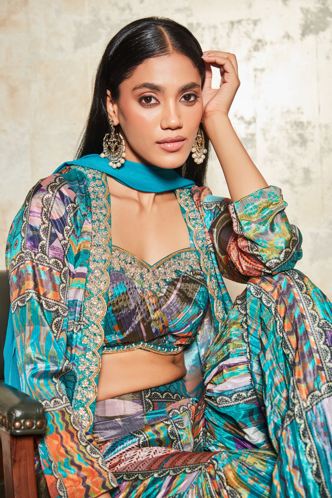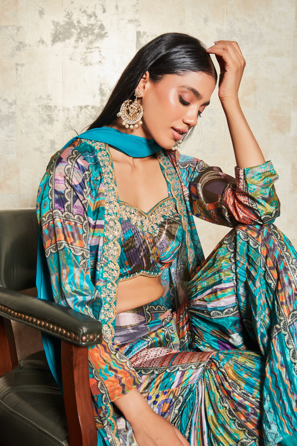 BLUE SHARARA SET WITH FLORAL ZARI EMROIDERED BLOUSE AND DUPATTA