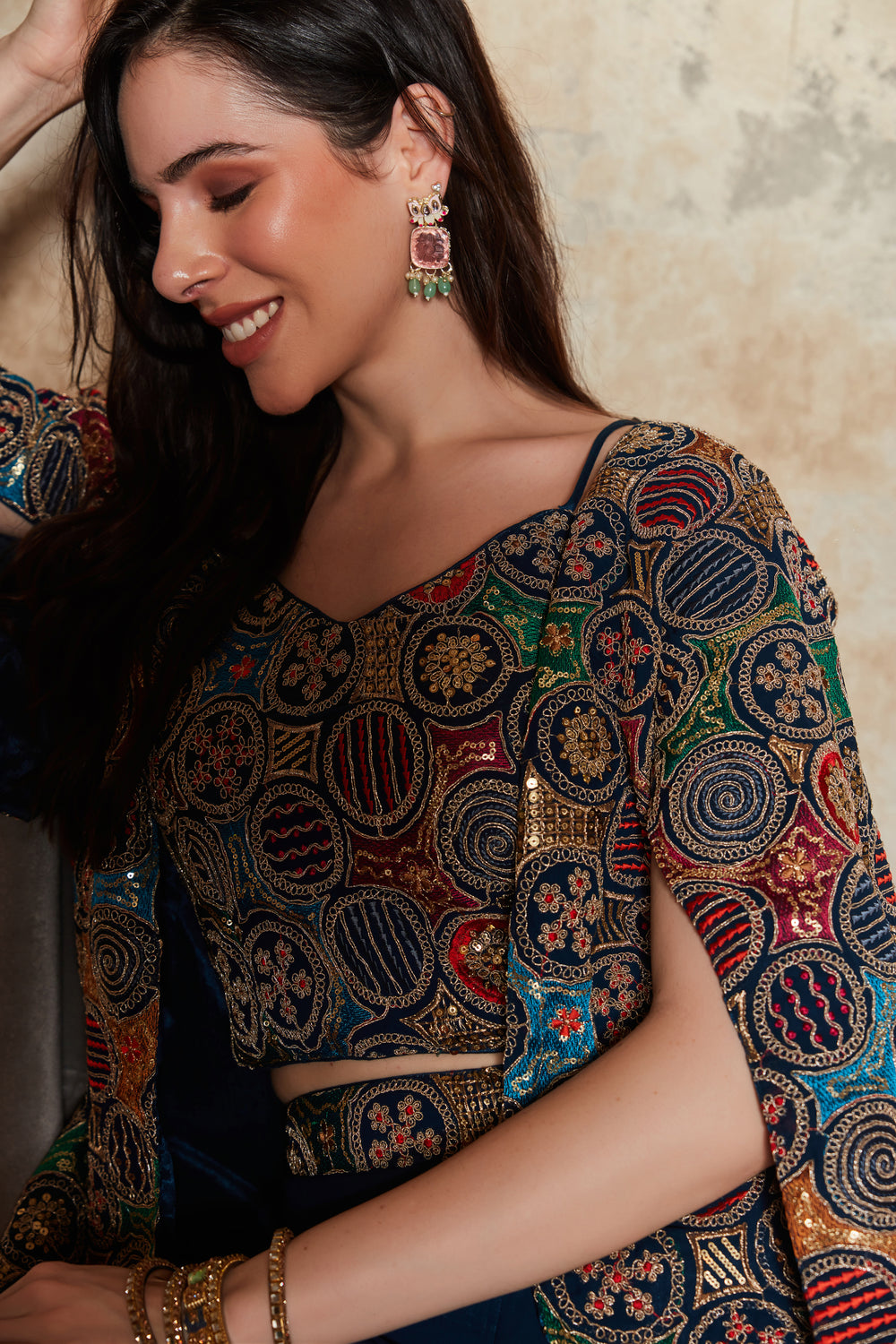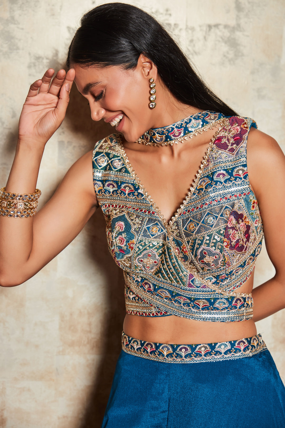 Royal Blue Embroidered Crop Top And Palazzo Set In Crepe