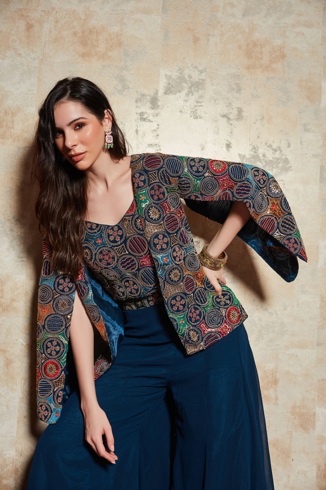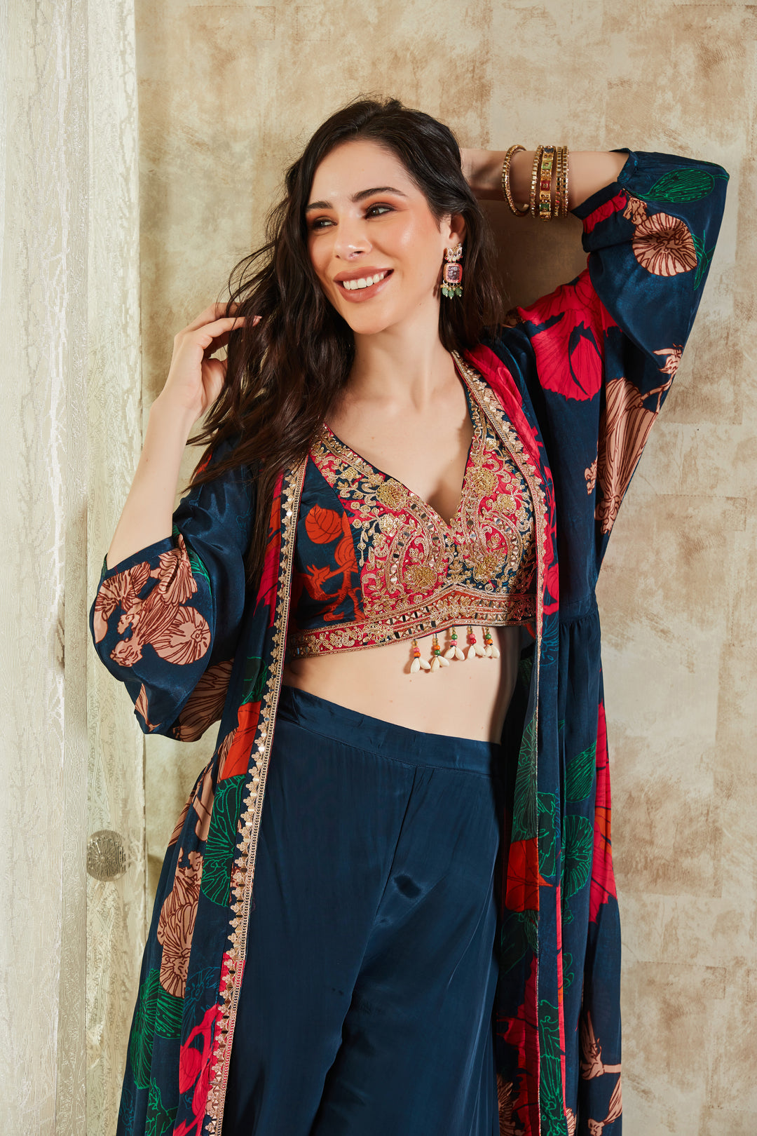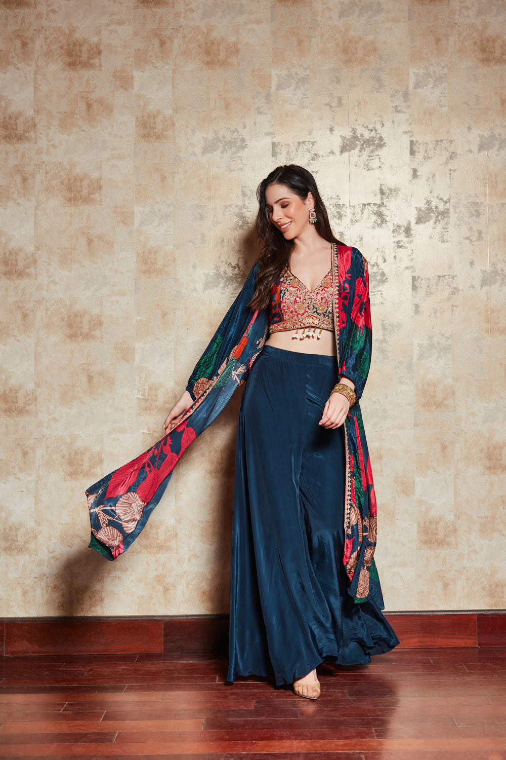BLUE PLAZO SET WITH FLORAL HAND EMBROIDERED TOP
