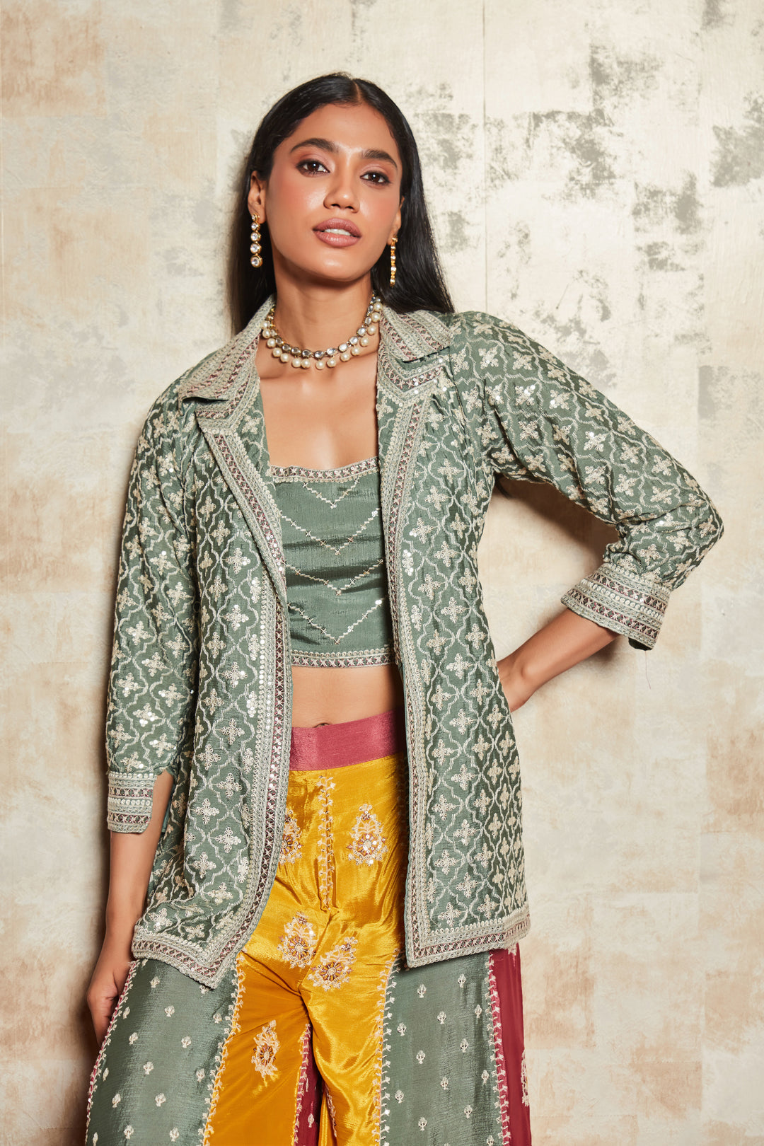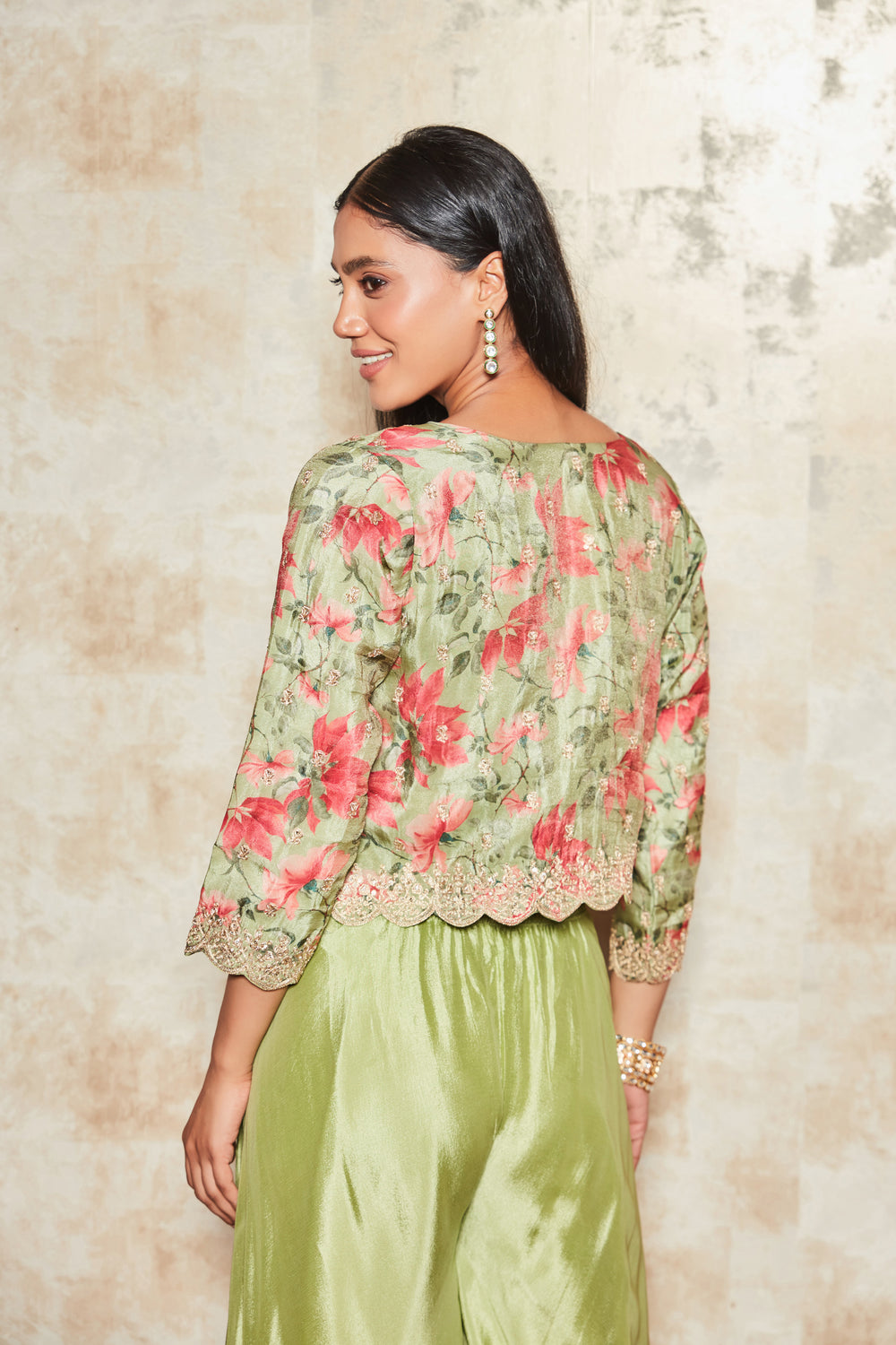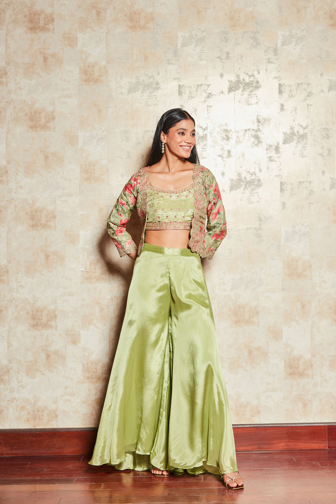 CREPE PASTEL GREEN SHARARA SET WITH FLORAL SHRUG