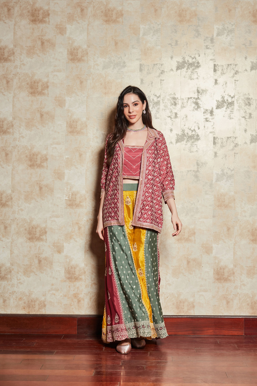 MUSTARD FLORAL EMBROIDERD JACKET SET WITH BLOUSE AND PANTS