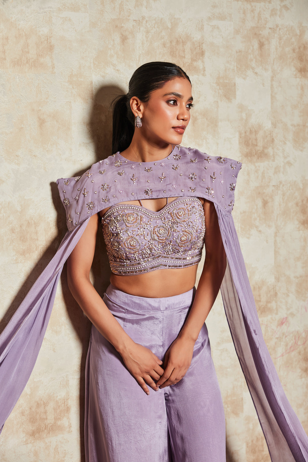 LILAC EMBELLISHED DIVIDER SET WITH GEORGETTE SHRUG AND BLOUSE